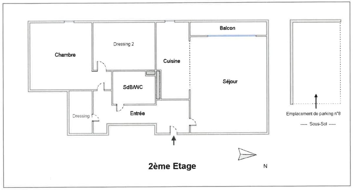 Il se compose d’une entrée aménagée, d’un séjour ouvrant sur le balcon, d’une grande cuisine aménagée et équipée, d’un couloir desservant une salle de bains avec WC, un dressing ainsi qu’une grande chambre aménagée avec un espace bureau distinct.
